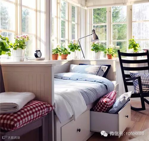 阳台区主人也没浪费,装修成了一个简单的休闲区,可以躺在小床上沐浴着午间阳光休憩,也可以捧一本书籍在摇椅上享受下午茶时光。满窗的小绿植和窗户绿景遥相呼应。