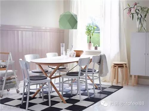餐厅以几何简约拼凑出图形的个性美感,除了桌椅之外收纳便捷的小凳可以随时扩展餐厅的容量。绿色的几何形个性吊灯,增添了一丝春日的清新气息。
