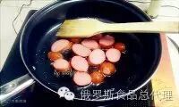 4.在不粘锅内加入适量油,先放入香肠,翻炒约半分钟。