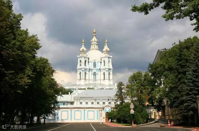是俄罗斯巴洛克风格的圣彼得堡教堂,由淡蓝色的墙面和白色的圆柱建成,金色的穹顶闪耀着迷人的光芒。