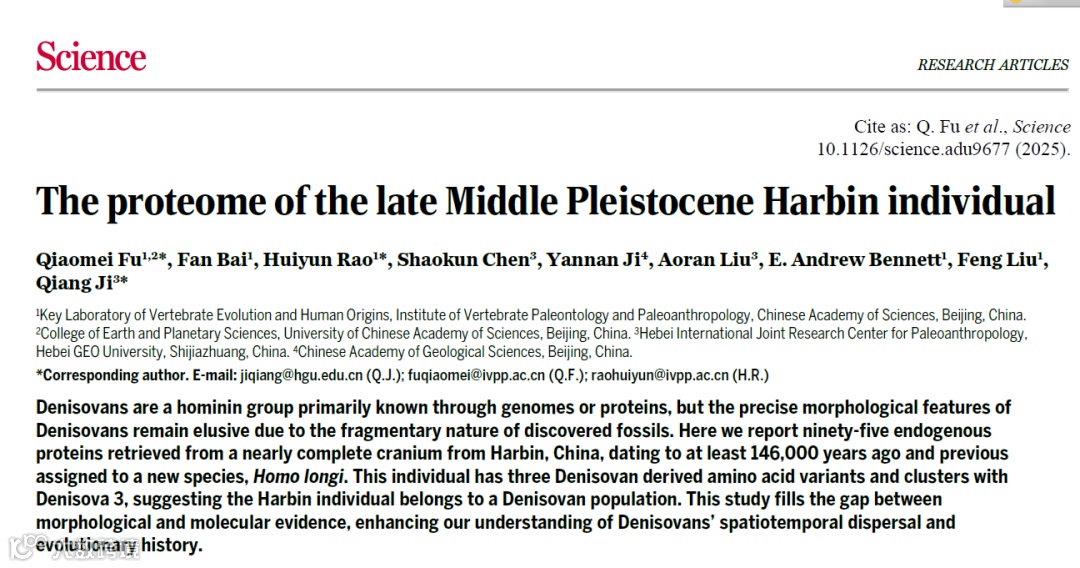 中科院古脊椎动物与古人类研究所付巧妹教授团队在《Science》上发文,对河北地质大学博物馆收藏的哈尔滨古人类头骨样本进行了深入的古蛋白质组学研究, 证实 14.6 万年前的哈尔滨头骨属于丹尼索瓦人[3]。