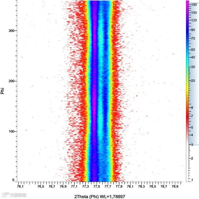 ▲图3. DIFFRAC.EVA软件二维展示使用Co特征X射线测量的轧制铝板样品的Phi-1D扫描图谱