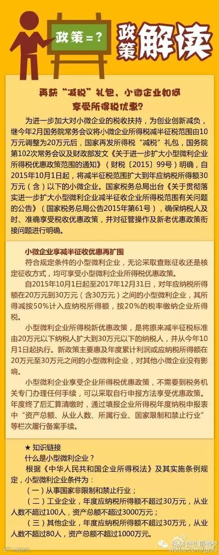 小微企业享减半征收优惠再扩围——自2015年10月1日起至2017年12月31日,小型微利企业所得税新优惠政策,是将原来减半征税标准由20万元以下纳税人扩大到30万元以下的纳税人。