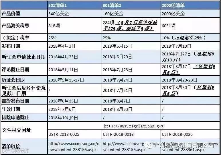 上图是机电商会梳理的中美贸易战美国301措施3个清单对比图:包括已经于7月6日生效的340亿美元产品清单、8月23日生效的160亿美元产品清单,以及正在举行听证会的2000亿美元产品清单。