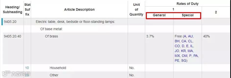2. 查询进口关税:搜索页面中Rates of Duty 1左边一栏“General”为一般进口税率,右边一栏“Special”是美国对特定国家征收的进口税率。