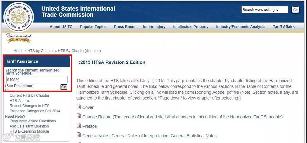 1. 查询HTS CODE:进入上述网站,在Tariff Assistance项下Search the current Harmonized Tariff Schedule...下的搜索框中输入输入中国HS CODE的前六位数,如台灯940520****,搜索结果页面的左边框有详细的HTS CODE,根据自己的产品选择HTS CODE。