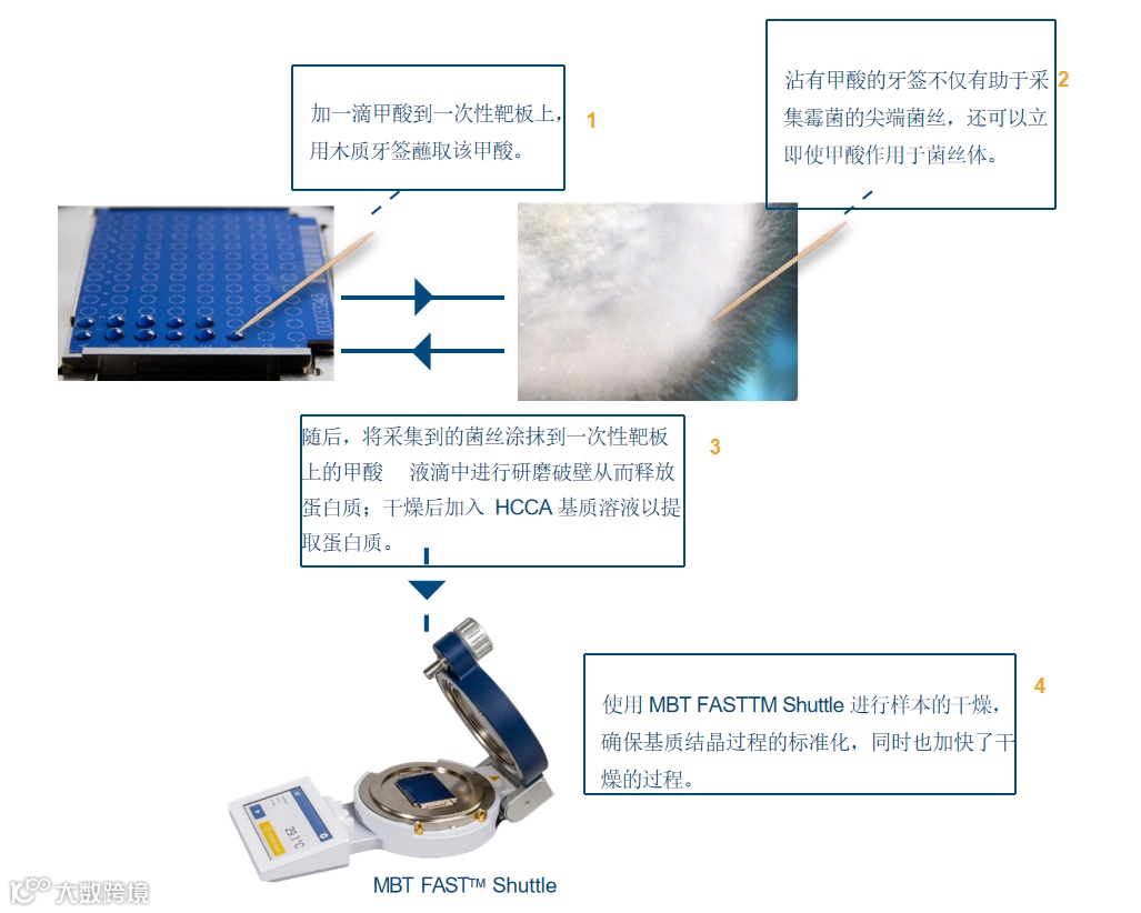 该工作流程巧妙利用 MBT Biotarget 96 靶板的表面结构 —— 其微粗糙表面可确保真菌样本在 MALDI 靶板上充分均质化并有效破裂细胞。
