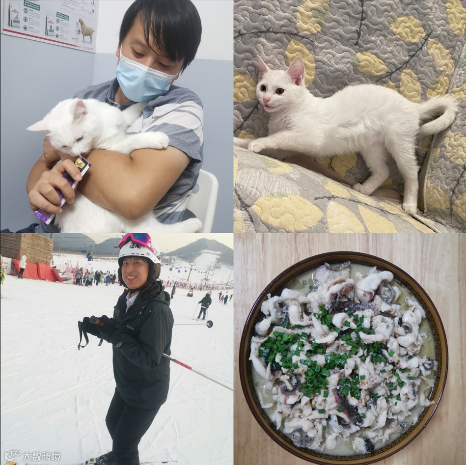 工作之余,我最喜欢的是做饭,每个周末我都会在家好好做两顿午饭犒劳自己和家人。前年我家女王带回来一只小猫,她以一个化学家的名字命名这个小猫叫做勒夏,在宠物医院打疫苗时护士听着这个发音以为是“乐夏”,我倒觉得也非常贴切,在一个快乐的盛夏午后她来到我家,开始无忧无虑的慵懒猫生。干饭撸猫之余,我还会去动一动来抑制膨胀的身躯,去年我终于在摸爬滚打后学会了滑雪,希望自己能够坚持锻炼,保持好身体在布鲁克Happy and Busy!