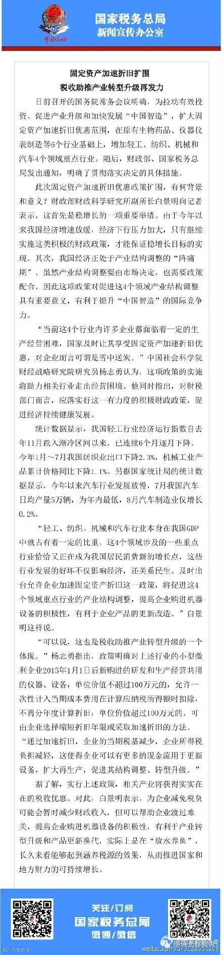 导读:轻工、纺织、机械、汽车4行业日前纳入固定资产加速折旧优惠范围。财政部财科所副所长白景明表示,相关产业将获得实