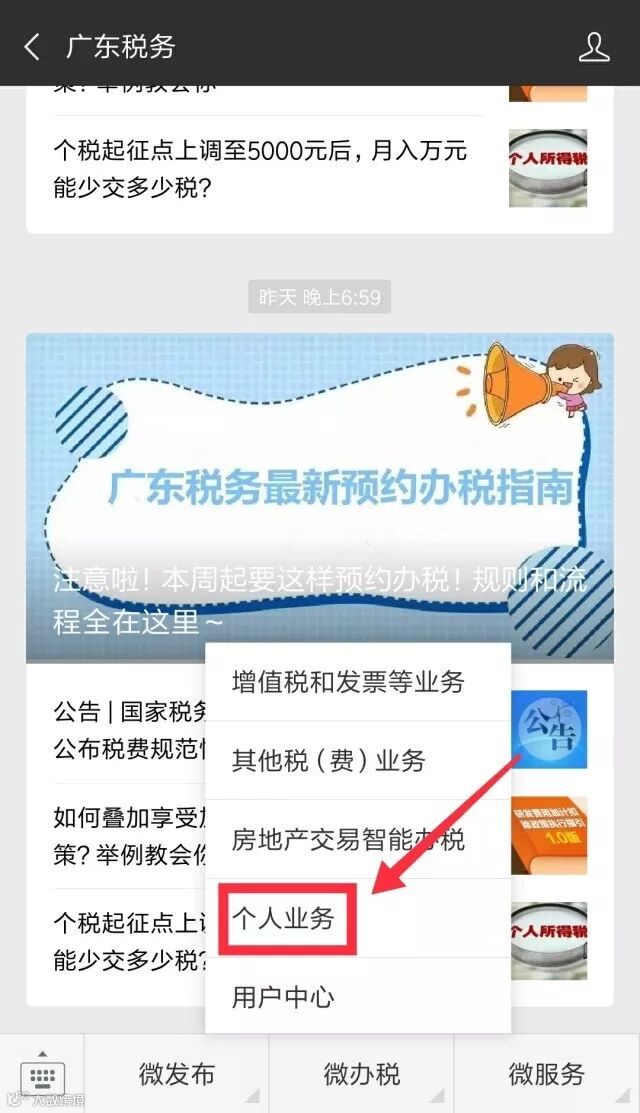 进入【广东税务】微信公众号,在【微办税】选择【个人业务】;