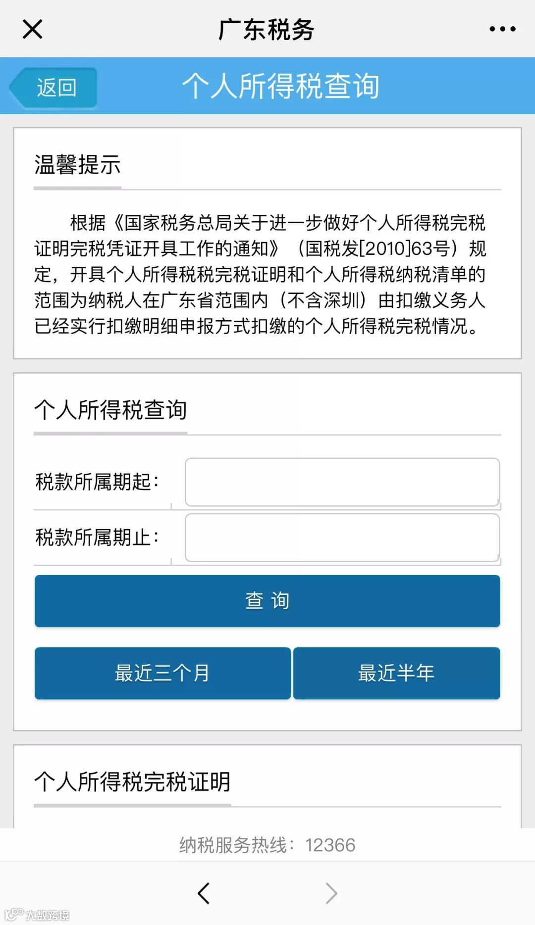 点击【返回】按钮,返回个人所得税查询界面,根据个人需要选择时间段,点击【查看完税证明】,进入个人所得税完税信息界面;