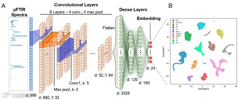 AI解决方案: 深度卷积神经网络(CNN)仅使用“洁净滤膜”上获取的微塑料光谱进行“相似性学习”训练。在训练过程中,模型学习到如何生成能使同类微塑料光谱聚集、不同类微塑料光谱分离的“特征嵌入向量(Embedding)”。