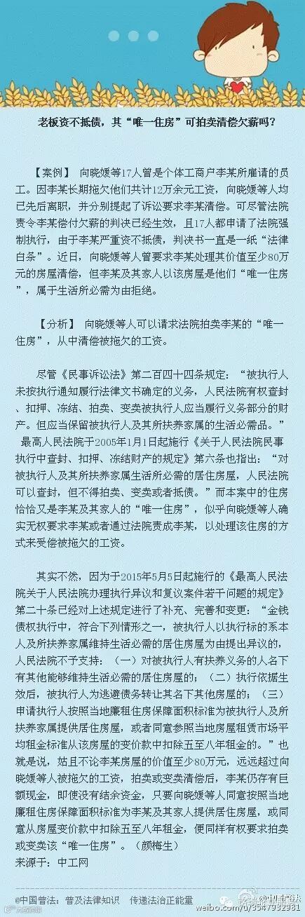 由于李某长期拖欠员工工资,被员工起诉至当地法院,后经审理,法院责令李某偿付欠薪。尽管判决已开始生效,但由于李某严重资不抵债,判决书一直是一纸“法律白条”。那么问题来了,李某名下的“唯一住房”可以拍卖清偿欠薪吗?