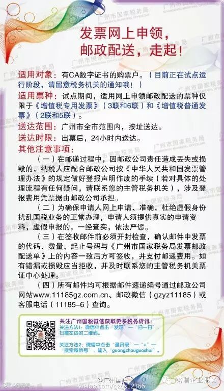 为积极响应“便民办税春风行动”,进一步提升纳税服务水平和工作效率,广州国税现已开通发票邮寄配送服务!实现发票“网上申领邮寄配送”,纳税人可以足不出户便可办理发票领用业务。马上为您介绍邮政配送发票适用对象、票种、送达范围与时限!↓↓↓