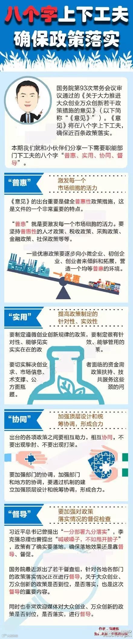 国务院第93次常务会议审议通过了《关于大力推进大众创业万众创新若干政策措施的意见》。戳图,了解需要职能部门下功夫的八个字“普惠、实用、协同、督导”,gogogo