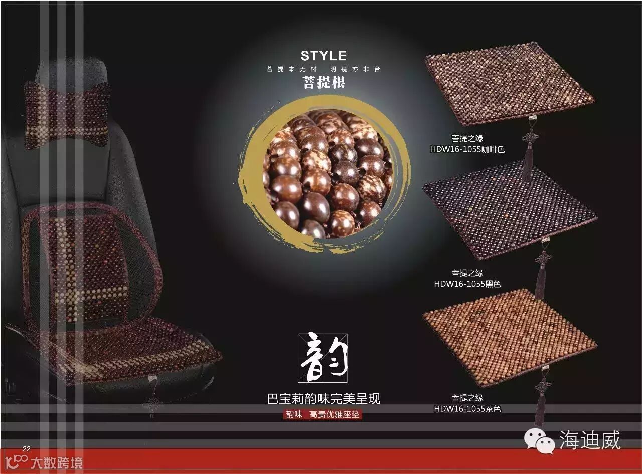 我公司致力于研发生产销售海迪威高端木珠座垫系列产品,主要由中高档木珠汽车座垫、木珠头枕、木珠腰靠、及各种四季垫等产品,产品主要以设计新颖高端为主,深受广大用户好评!海迪威宗旨-您的满意才是我们的骄傲!!!