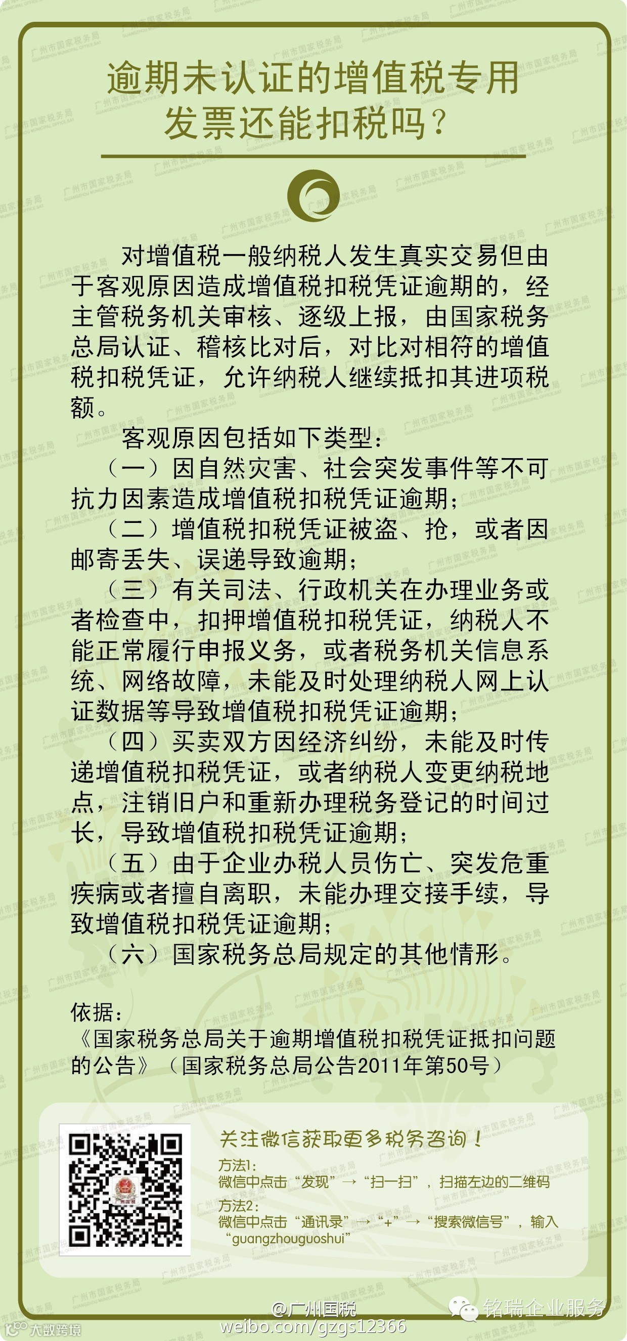 广州诚丰信企业服务有限公司未在规定期限内到税务机关办理认证、申报抵扣或者申请稽核比对的增值税扣税凭证,不得作为合法的增值税扣税凭证,不得计算进项税额抵扣。特殊情况,请见下图↓
