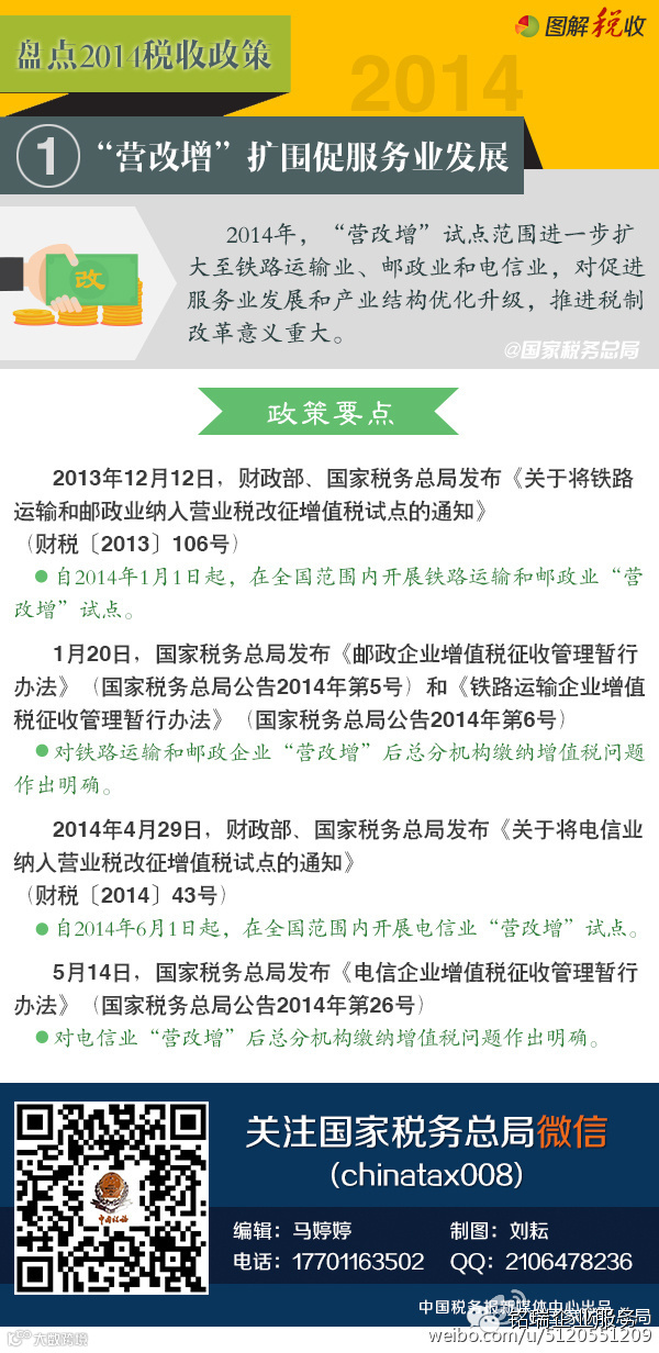 2014年,“营改增”试点范围进一步扩大至铁路运输业、邮政业和电信业,对促进服务业发展和产业结构优化升级,推进税制改革意义重大。