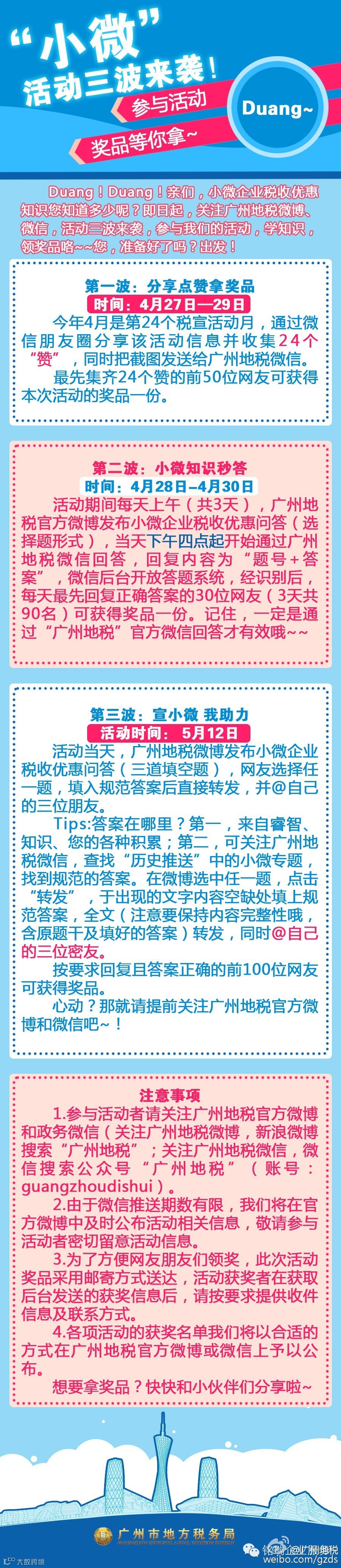 即日起,关注广州地税微博、微信,活动三波来袭,参与我们的活动,学知识,领奖品咯~~您,准备好了吗?出发!