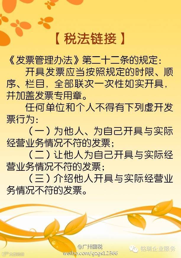 广州诚丰信企业服务有限公司【虚开发票不可为[不要]】根据《发票管理办法》第二十二条的规定,任何单位和个人不得有下列虚开发票行为:1.为他人、为自己开具与实际经营业务情况不符的发票;2.让他人为自己开具与实际经营业务情况不符的发票;3.介绍他人开具与实际经营业务情况不符的发票。