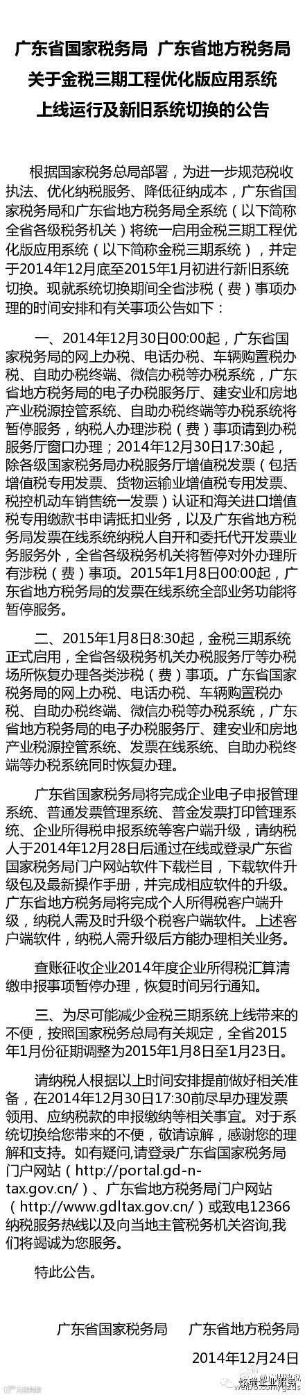 根据部署,省国税和省地税全系统将统一启用金税三期工程系统,并于近期进行新旧系统切换。公告内容重要,再次提醒广大纳税人详细阅读并提前做好准备!