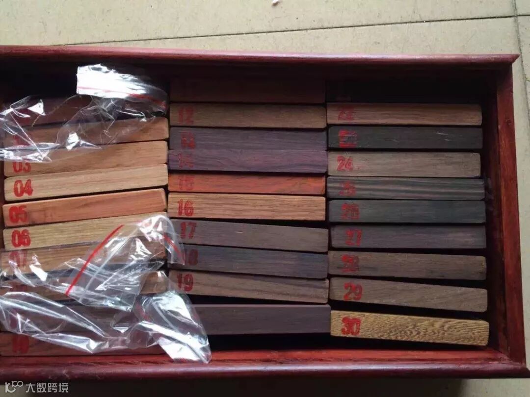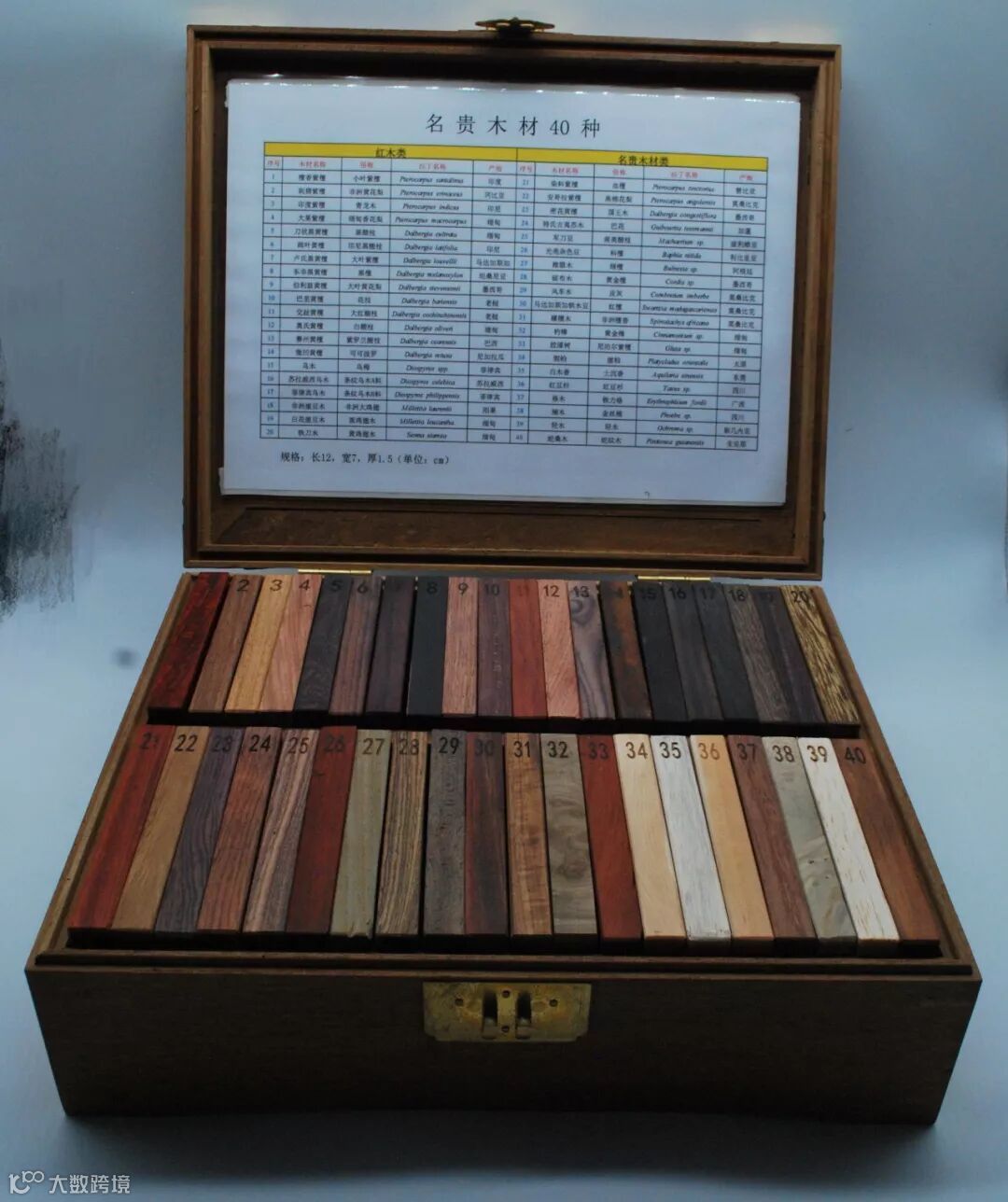 一名木材研究者,根据《红木》GB/T 18107-2017 等标准,对中国国内市场现有流通的红木及名贵木材采集加工,研制出一套《名贵木材40种》,使用缅甸柚木相框结构盒子包装,其中属於国家标准已经列出到树种的红木木材样品20种,其他红木或名贵木材20种,样板规格大小:12厘米×7厘米×1.5厘米,详细下表中的树种附录名单。
