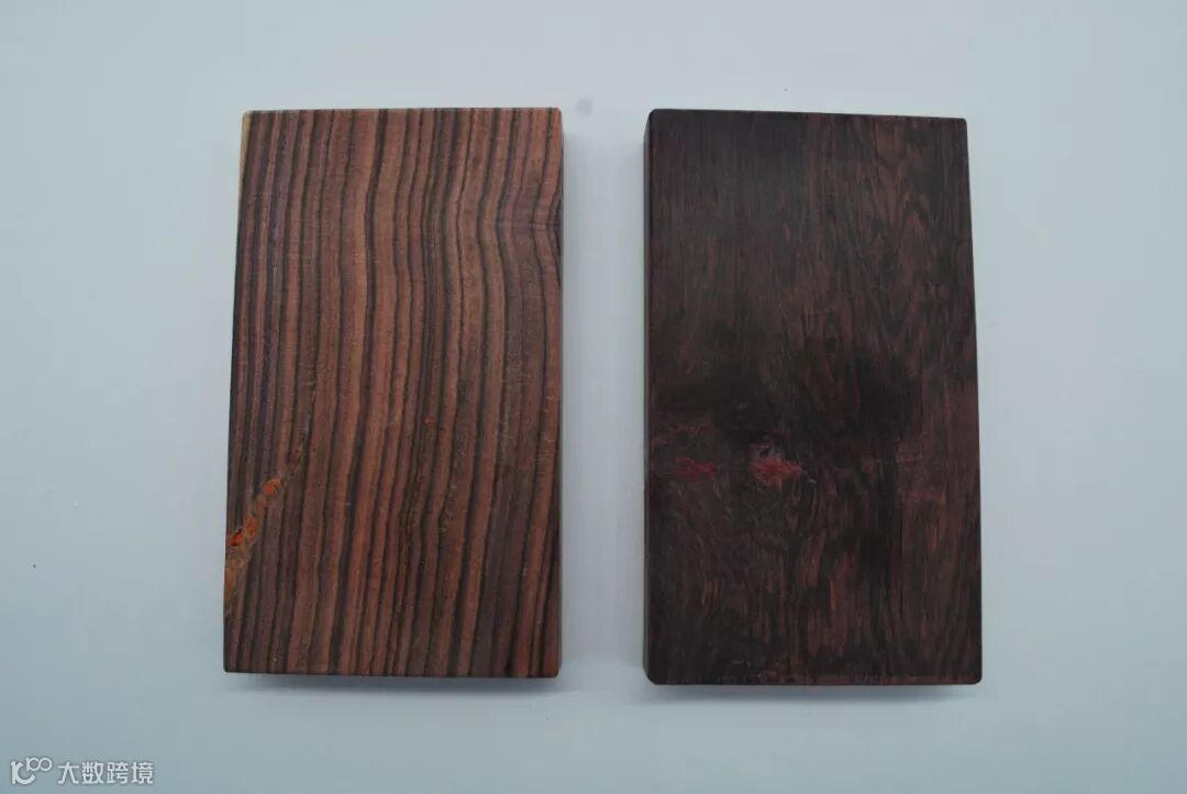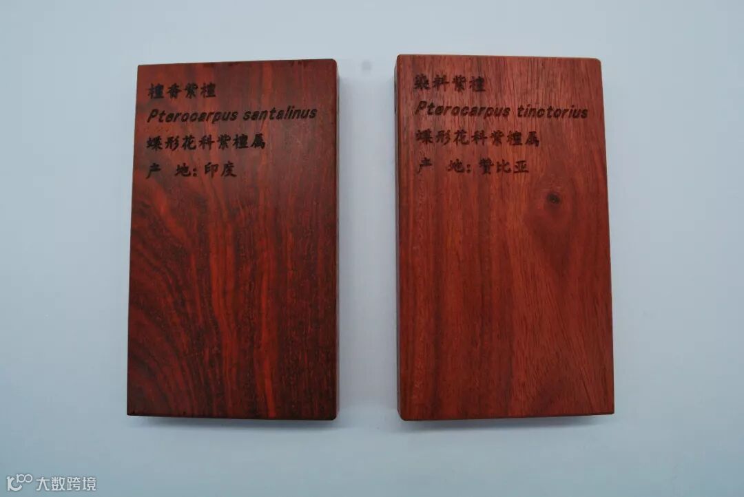 上二图:木材样品中紫檀(印度原产)与血檀(非洲原产)的样品对比