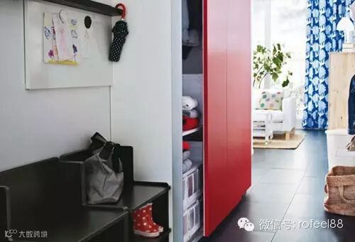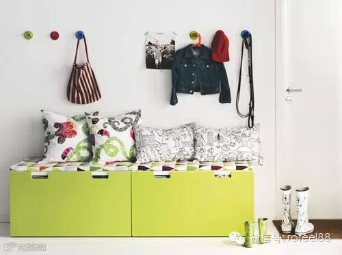 箱式的坐凳是孩子们喜欢的款式,自己爬上去,坐在柔软的垫子上换鞋,非常有成就感。如果在背后摆放几个靠垫,更能获得成年朋友的欢迎,毕竟,脊背不小心贴到冰冷的墙壁上,那种感觉不好受。箱子能拉开,内部能放包包,如果客人有需要单独保管的物品,也可以放在里面,以免聚会场面太乱被损坏。