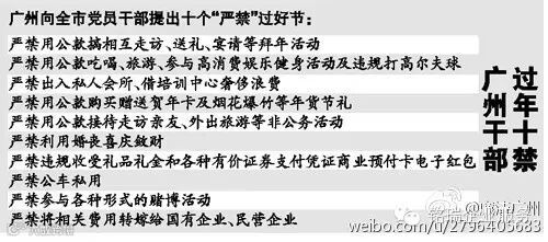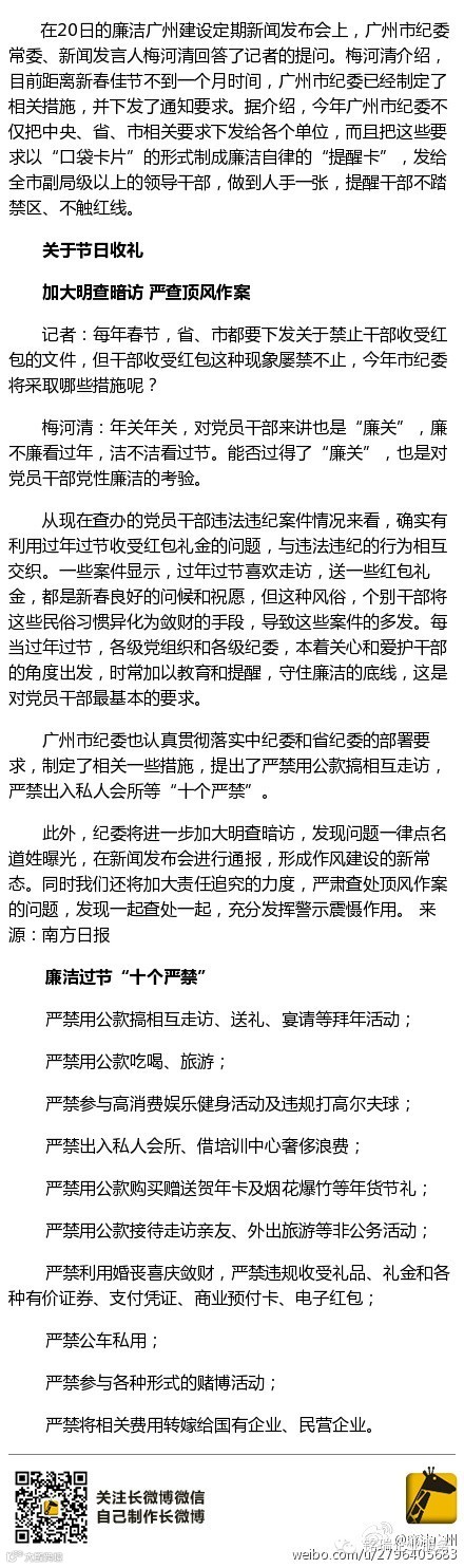 春节将至,在昨日的廉洁广州建设定期新闻发布会上,梅河清介绍,根据中央和省、市要求,广州市纪委已提出关于廉洁过节的“十个严禁”,并制作廉洁自律“提醒卡”,下发给全市副局级以上干部,提醒干部不踏禁区、不触红线。