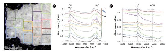 他们利用布鲁克的LUMOS FT-IR显微镜透射模式分析了反应产物。使用FT-IR测定水的丰度和形态,通过分析3570 cm-1和1630 cm-1波长附近的吸收带计算总溶解水和溶解为分子态的H2O。通过分析4500 cm-1波长附近的吸收带计算溶解为游离态OH的水。
