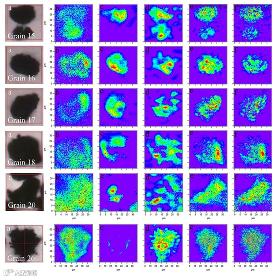 a) 颗粒的可见显微图像,b) 1180–850cm-1对应于硅酸盐中的Si-O延伸,e) 3000–2800cm-1对应于脂肪族 C-H延伸。图像的颜色代表吸光度,红色代表最高,紫色代表最低。