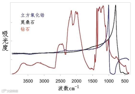 图2:钻石、立方氧化锆和莫桑石的FITR谱