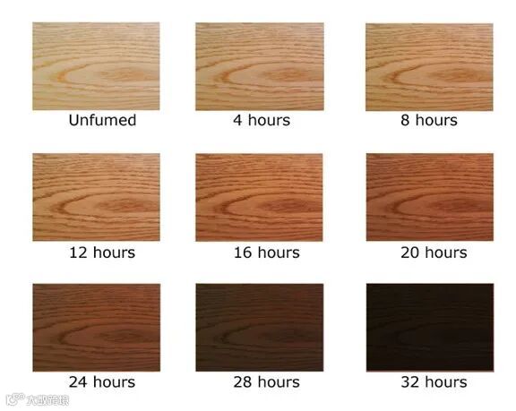 工业化生产时,氨气熏蒸发生在密封的室内,使木材暴露于氢氧化铵中使木材变暗,其由外到内颜色逐渐变浅,在经过切割后就可以形成独特的色彩纹路。这种地板和家具产品具有独特的特征和美感,深受许多消费者的偏爱。由于烟气中有大量的氨气残留,因此在处理后必须进行良好通风。