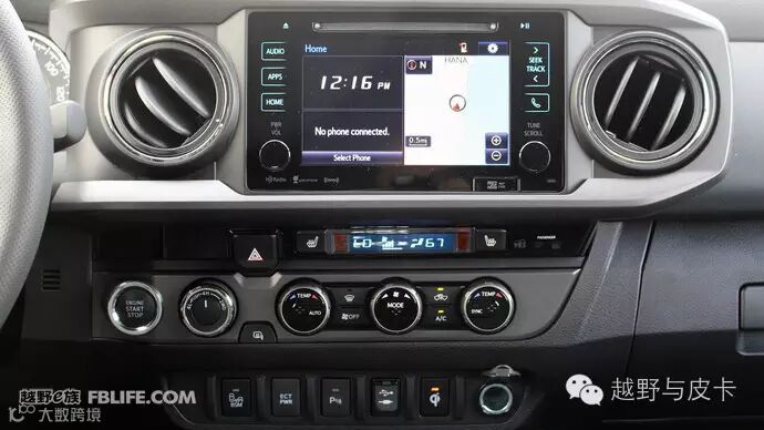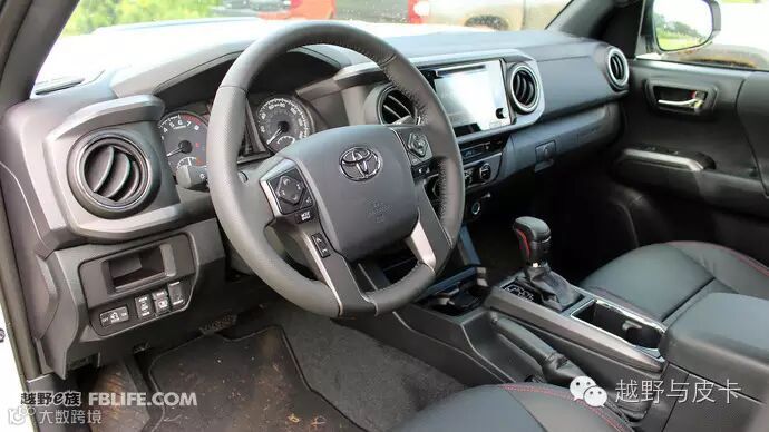 内饰方面,Tacoma TRD Pro基本与TRD Off-Road相差不多,TRD PRO版配有可加热真皮座椅,7英寸的中央屏幕内置Entune车载系统,配备行车导航,Qi无线智能手机充电,以及4.2英寸的组合仪表屏幕,并带有倾角计以及侧倾俯仰显示,除此以外还有TRD Pro独特的地毯以及换挡杆。但是跟其余系列一样,座椅的布置略低,地板高度略高,导致驾驶员的位置稍显尴尬,空间也有些局促,让人感觉是坐在一款轿车上,没有坐在皮卡上居高临下的感受。