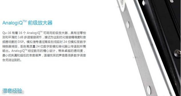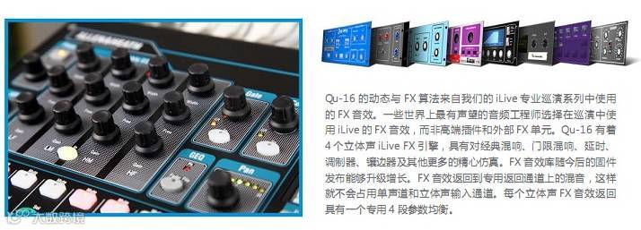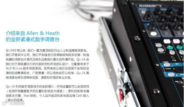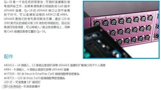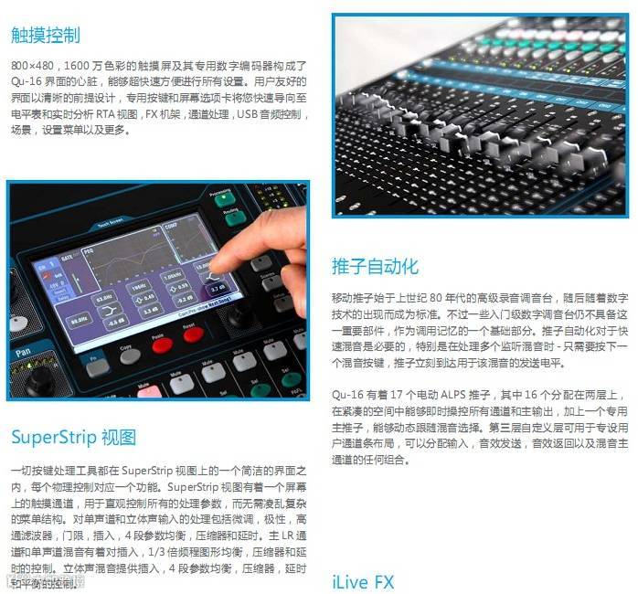 Qu-16 主要特点:• 16路单声道话筒/线路通道• 3路立体声线路通道、24路源到混音• 12路混音(4路单声道,3路立体声,LR)• 4路FX(2路发送总线)、24路,22路输入USB音频流• 额外的立体声输出一个AES数字,Alt输出,2TRK输出• 对讲话筒输入• dSNAKE Cat5数字用于AR2412/AR84/AB168远程音频• 4个静音编组、4个DCA编组、4个可分配软件• AnalogiQTM完全调用模式前级放大器• 效果来自iLive FX调音台• 专用立体声FX效果返回通道• 主通道用于快速访问混音电平和处理• 输入通道连接用于立体声音源• 输入处理— —前置放大器、高通滤波、门限、参量均衡、压缩器、延时 • 输出处理— —参量均衡、图示均衡、压缩器、延时• 800×480像素彩色触摸屏,可迅速控制• 电动推子用于推子上发送,图形均衡推子切换查看以及混音调用• 快速复制并重置设置和场景• 100个场景记忆• 通道安全,全局和每个场景调用过滤器• 通道处理用户库• Qu-Drivet用于在USB硬盘上进行立体声和18轨录音/播放• 苹果Mac计算机的MIDI DAW控制驱动(转换为HUI或Control)• USB传输场景,库数据,演出,用户可分配自定义层• Qu-Pad无线远程应用用于iPad• 兼容Allen&Heath ME个人混音系统• 用户权限以限制操作者访问