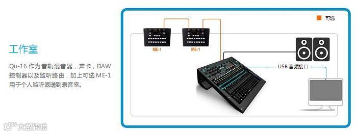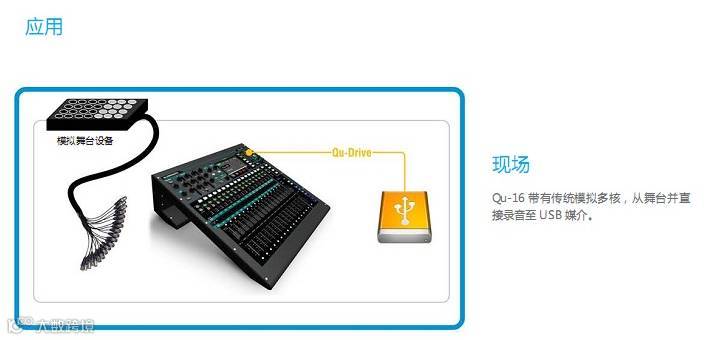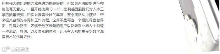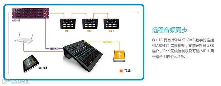Qu-16 专业音频数字调音台利用数字混音技术的全部潜力,所有设置都可以全面调用(包括所有重要推子的位置和前级放大增益),便利的录音与播放解决方案,iPad 控制,个人监听选项和本地或远程 Cat5 输入/ 输出的选择。