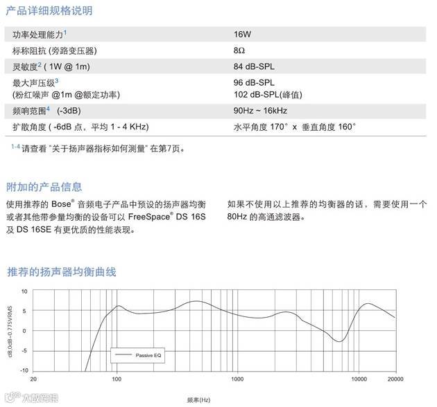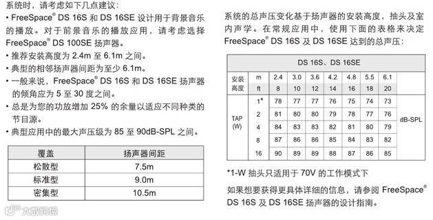 DS 16S和DS 16SE扬声器可以用做阻抗为8Ω,功率为16W的扬声器,或用作 70V/100V 的定压扬声器。通过拇指旋钮简便快捷地设置抽头,无需使用工具。使用推荐的Bose音频电子产品中预设的扬声器均衡或者其他带参量均衡的设备可以使FreeSpace DS 16S及DS 16SE有更优秀的声能表现。另外DS 16S和DS 16SE扬声器能很好地与FreeSpace DS 16F天花板扬声器声学兼容,作为一个完整的系统混合使用。