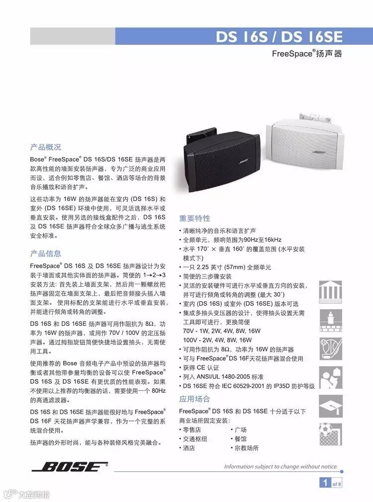 Bose FreeSpace DS 16S及DS 16SE扬声器是两款高性能的墙面安装扬声器,专为广泛的商业应用而设,适合用于零售店、餐馆、酒店等场合的背景音乐播放及语言扩声。