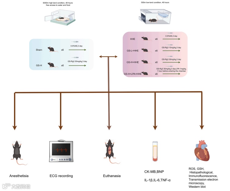 在该研究中,研究人员利用低压缺氧舱模拟了海拔6000米的高原低压缺氧环境,通过随机分组实验,采用心电图法、透射电镜观察、血清心肌损伤生物标志物分析及Western blot检测等实验方法探究了稀有人参皂苷Rg3对小鼠心脏损伤的影响以及具体作用机制。