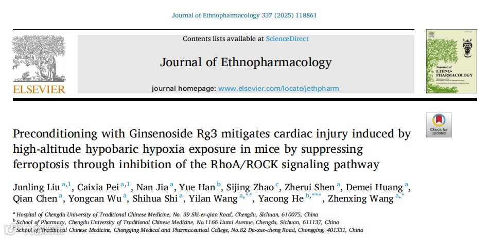 为此,近日由成都中医药大学附属医院等机构研究人员共同发表的《Preconditioning with Ginsenoside Rg3 mitigates cardiac injury induced by high-altitude hypobaric hypoxia exposure in mice by suppressing ferroptosis through inhibition of the RhoA/ROCK signaling pathway》就稀有人参皂苷Rg3的潜在心脏保护作用以及稀有人参皂苷Rg3预处理如何通过抑制心脏组织RhoA/ROCK通路和铁死亡来改善心脏损伤进行了深入探讨。