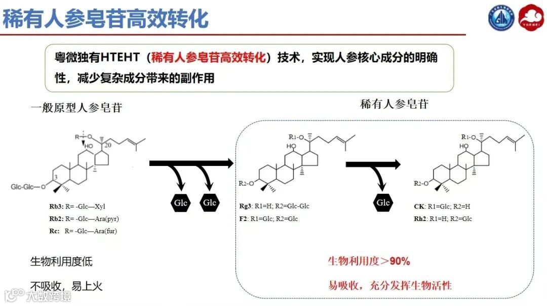 粤微科研团队经过历年来的不懈探索和攻坚,终于迎来了里程碑式的突破。粤微独创HTEHT技术,实现了普通人参中的原型人参皂苷向吸收率更高、生物活性更强、安全性更高的稀有人参皂苷的转化。