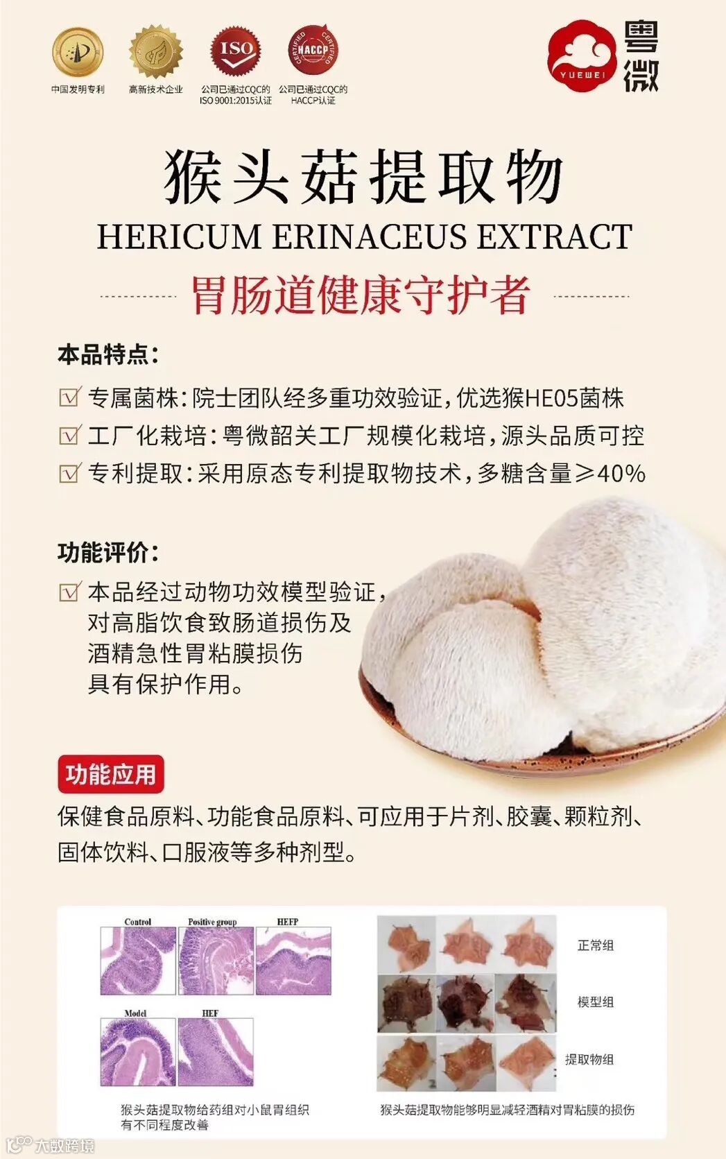 在猴头菇提取物研究方面,粤微同样成绩斐然。粤微科研团队经动物功效模型成功验证,粤微猴头菇提取物对高脂饮食致肠道损伤及酒精急性胃粘膜损伤具有保护作用。这一研究成果不仅为猴头菇在健康领域的应用提供了坚实的科学依据,也让粤微在猴头菇提取物领域占据了领先地位。