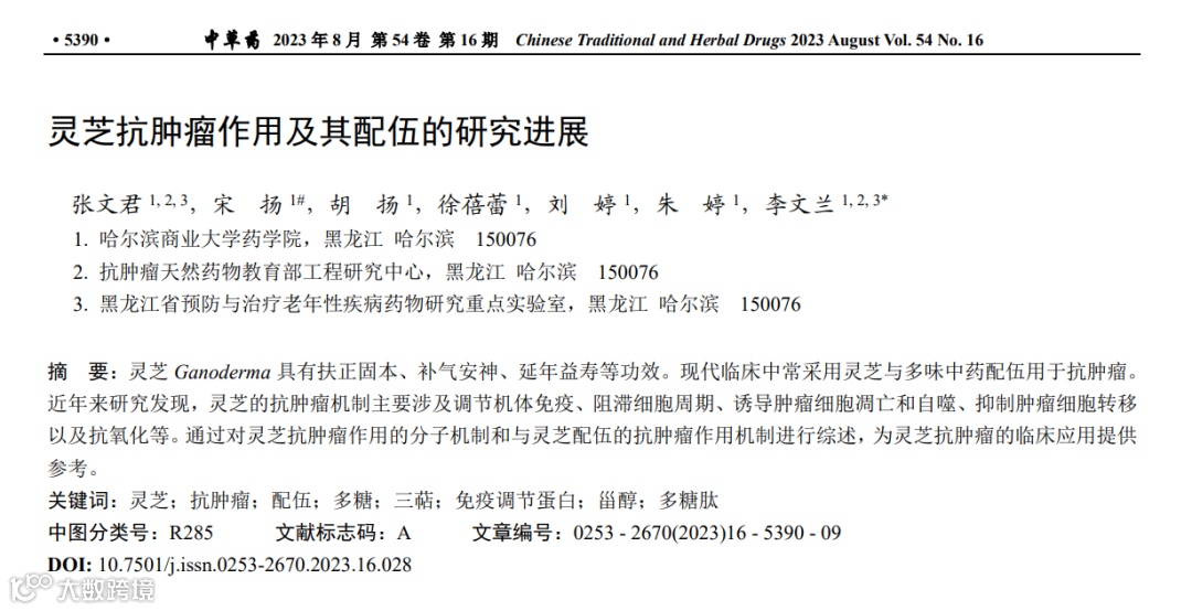 参考文献: [1]李聿蕙,刘董,胡丹,郑晓艳,吕筠,余灿清,裴培,段海平,高汝钦,逢增昌,田小草,孙点剑一.青岛市成年人腰围与缺血性脑卒中发病风险关联的前瞻性研究[J].中华流行病学杂志,2024,45(2):178-184 [2]张文君,宋扬,胡扬,等.灵芝抗肿瘤作用及其配伍的研究进展[J].中草药,2023,54(16):5390-5398.