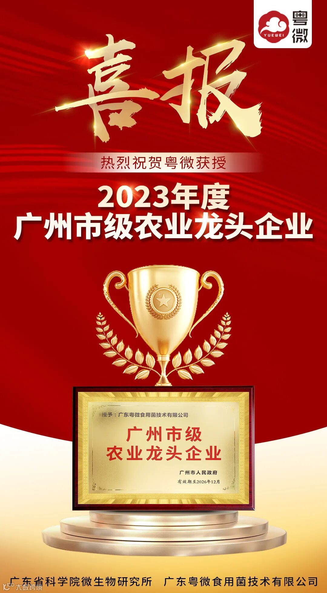 25年来,粤微一直致力于食药用菌功效研究及精深加工。发表国内外高水平论文140多篇,承担重大科技项目50余项,获国家科技进步二等奖1项、广东省科技一等奖2项、广东省发明专利奖3项,获得美国授权发明专利3件、中国授权发明专利70余件。 此次获授的“2023年度广州市级农业龙头企业”,是粤微继“广东省食用菌工程技术研究开发中心”、“国家博士后科研工作站”、“国家知识产权优势企业”、“国家高新技术企业”之后的获得的又一殊荣。充分体现出粤微的综合实力,更激励粤微持续精进、深耕科研技术创新,为推动行业高质量发展贡献智慧和力量。 END
