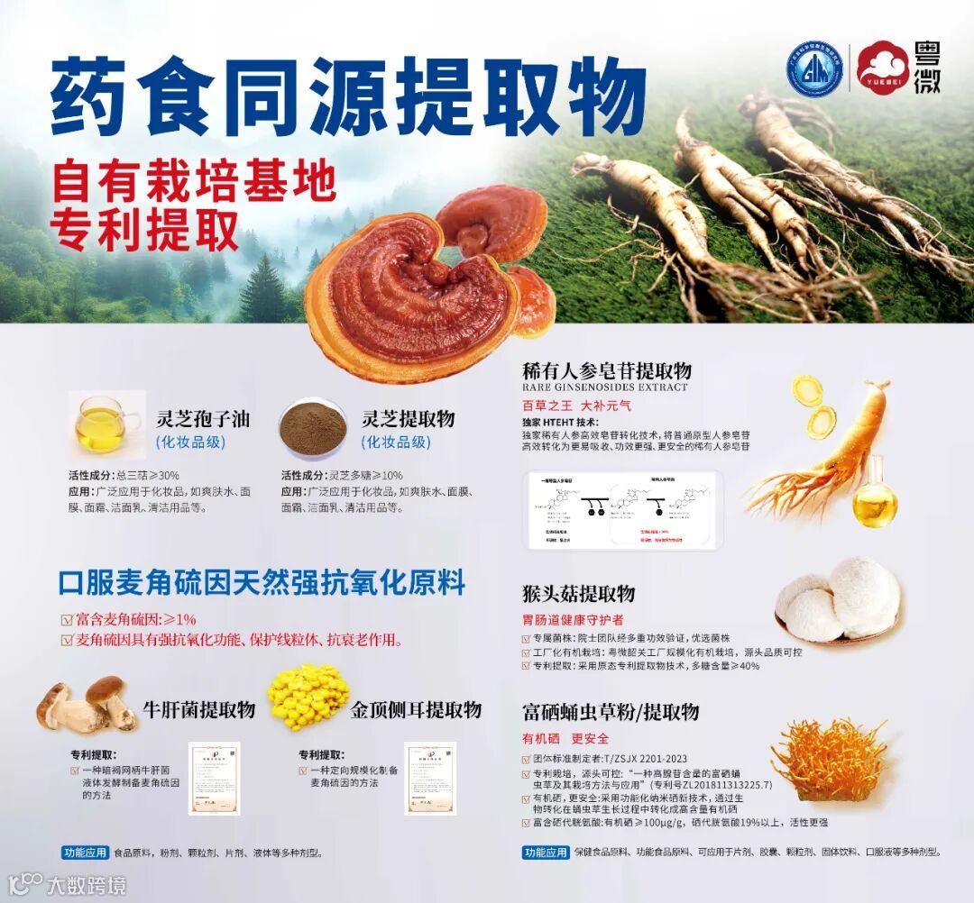 灵芝提取物在内服与外用方面均展现出卓越的抗衰功效。内服时,灵芝提取物中的多糖、三萜类化合物等活性成分能增强机体免疫力,促进细胞水平的能量合成,有效清除体内自由基,从而延缓衰老过程,改善睡眠质量,并具有一定的抗肿瘤作用。 外用方面,灵芝提取物的抗氧化和抗炎特性使其成为护肤品的优选成分,能帮助肌肤抵御外界侵害,淡化细纹,提升紧致度,为肌肤提供全面的呵护与修护,实现内外兼修的抗衰效果。 未来已来粤微邀您共启抗衰新篇章 在“精准营养”与“合成生物技术”驱动的抗衰新时代,粤微以“天然原料+尖端科技”双引擎,为品牌方提供从原料到成品的全链路支持。2月19-21日,诚邀您莅临广州PCHi2025【3F22-2展位】,解锁口服抗衰的无限可能! END
