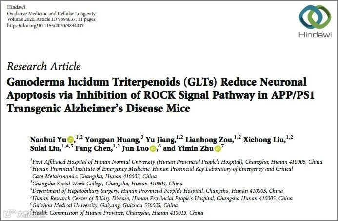 [5]Yu N, et al. Ganoderma lucidum Triterpenoids (GLTs) Reduce Neuronal Apoptosis via Inhibition of ROCK Signal Pathway in APP/PS1 Transgenic Alzheimer's Disease Mice. Oxid Med Cell Longev. 2020; 2020: 9894037.