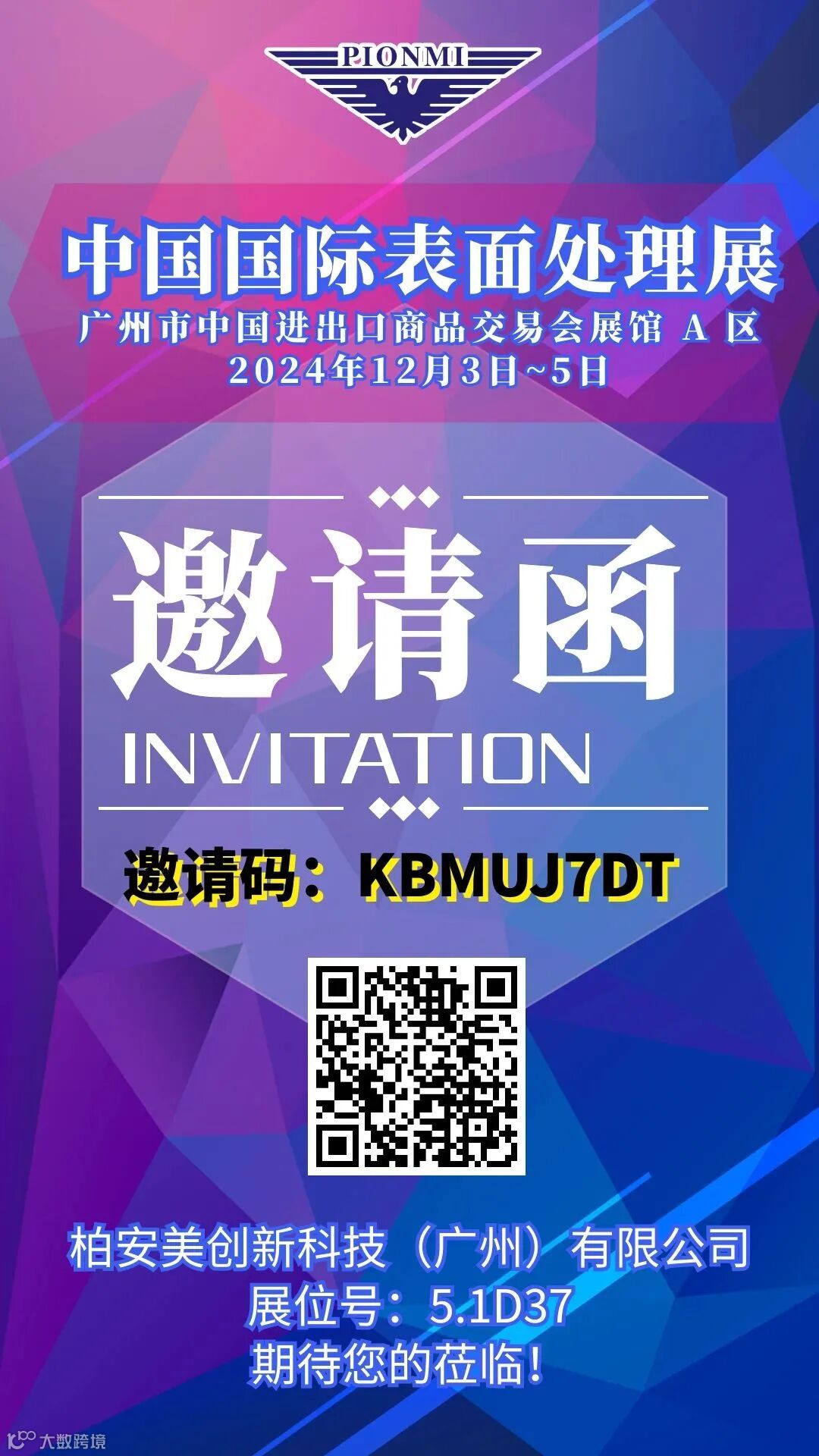 您好!柏安美创新科技(广州)有限公司将参加12月3日-5日在广州广交会展馆A区举办的“中国国际表面处理展”,展位号5.1D37 。