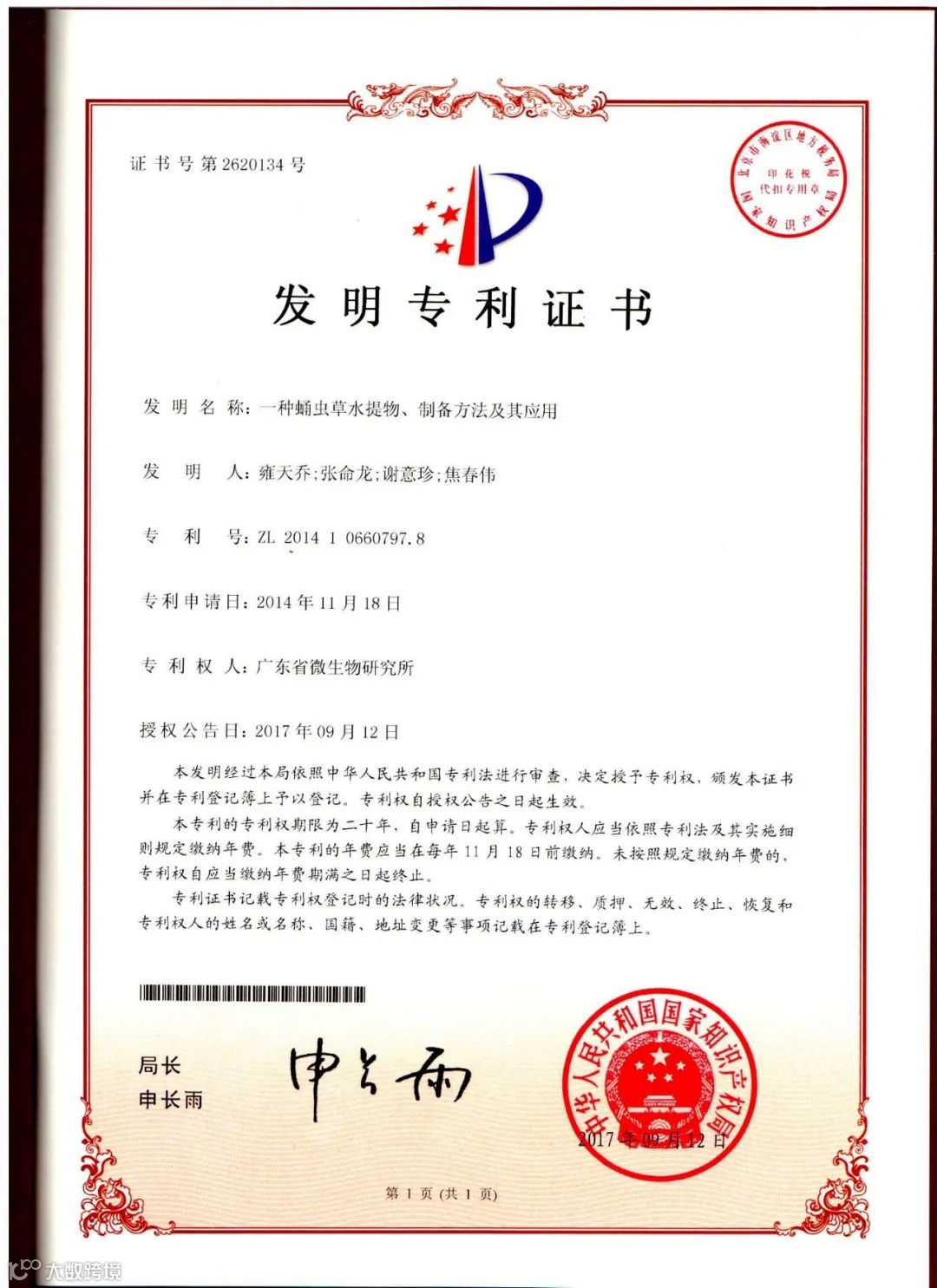 粤微蛹虫草提取物精选优质野生蛹虫草品种,通过人工筛选、驯化及独特的牛奶培养基培养,辅以粤微三大发明专利技术:ZL 201410660797.8(一种蛹虫草水提物及其制备方法和应用)、ZL 201811313225.7(一种高腺苷含量的富硒蛹虫草及其栽培方法与应用)及ZL 201711452746.6(一种治疗高尿酸血症的组合物及其制备方法和用途)制备而成,虫草素≥1000mg/100g,经多项实验研究证实,能够有效调降尿酸水平、缓解痛风症状。