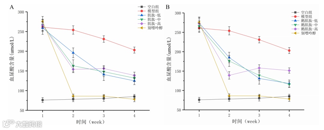 研究发现,不同剂量的鹅肌肽用于高尿酸血症大鼠治疗时,大鼠血尿酸含量均显著下降,而且鹅肌肽可以促进尿酸的排泄,鹅肌肽浓度越高,大鼠尿中尿酸排泄越多。此外,鹅肌肽还可通过其抗氧化、抗炎作用,抑制多种炎症因子的表达,降低类风湿性关节炎的尿酸水平,促进尿酸排出。