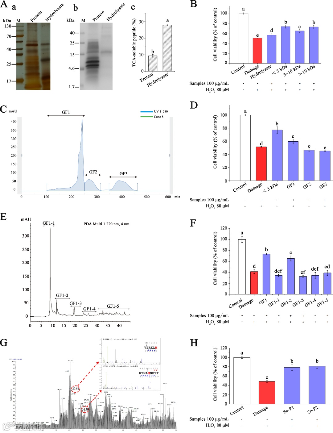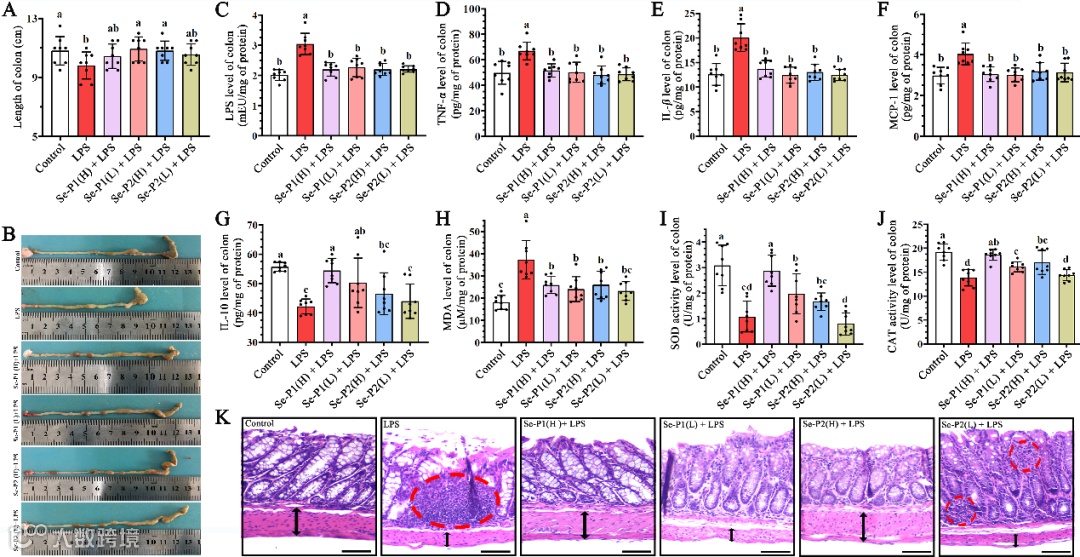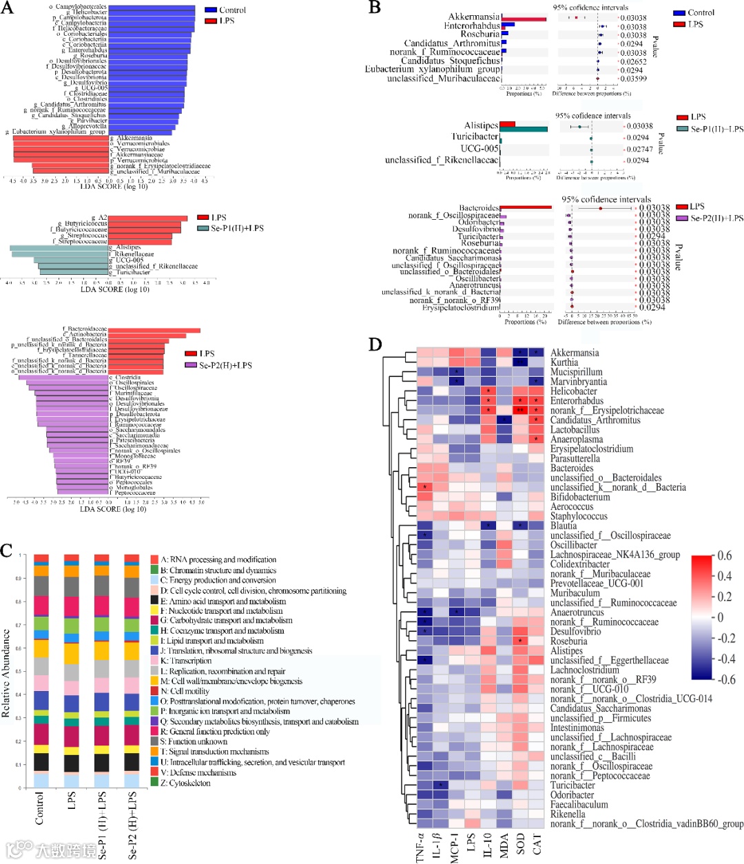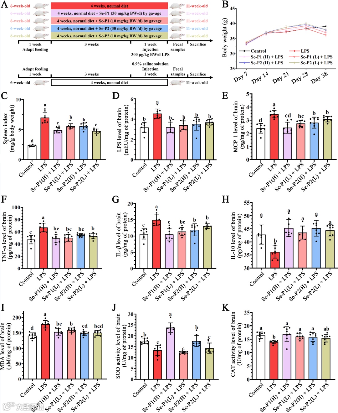 ①从富硒蛹虫草中分离得到具有神经保护作用的硒多肽VPRKL(Se)M(Se-P1)和RYNA(Se)MNDYT(Se-P2);②Se-P1和Se-P2可减轻LPS诱导的神经炎症和认知功能障碍;③Se-P1和Se-P2可缓解LPS诱导的肠道炎症和肠道菌群失调;④肠道内稳态、肠道菌群结构与神经炎症之间有密切的关系。